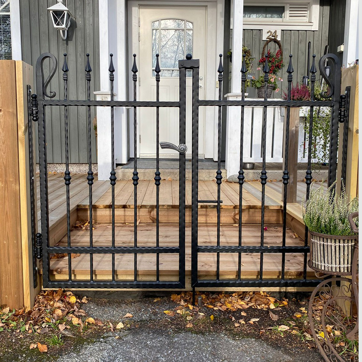 Valmistimme tämän 2 -osaisen käyntiportin omakotitaloon mittatilauksena. Portti on valmistettu vanhojen tolppien väliin sopivaksi. Toinen porttilehti on kiinnitettävissä maahan ja päivittäinen kulku tapahtuu toisesta porttilehdestä. Portissa on säppi, joka pitää porttilehdet yhdessä sekä koristeellinen kahva, josta toinen porttilehti on helppo avata.