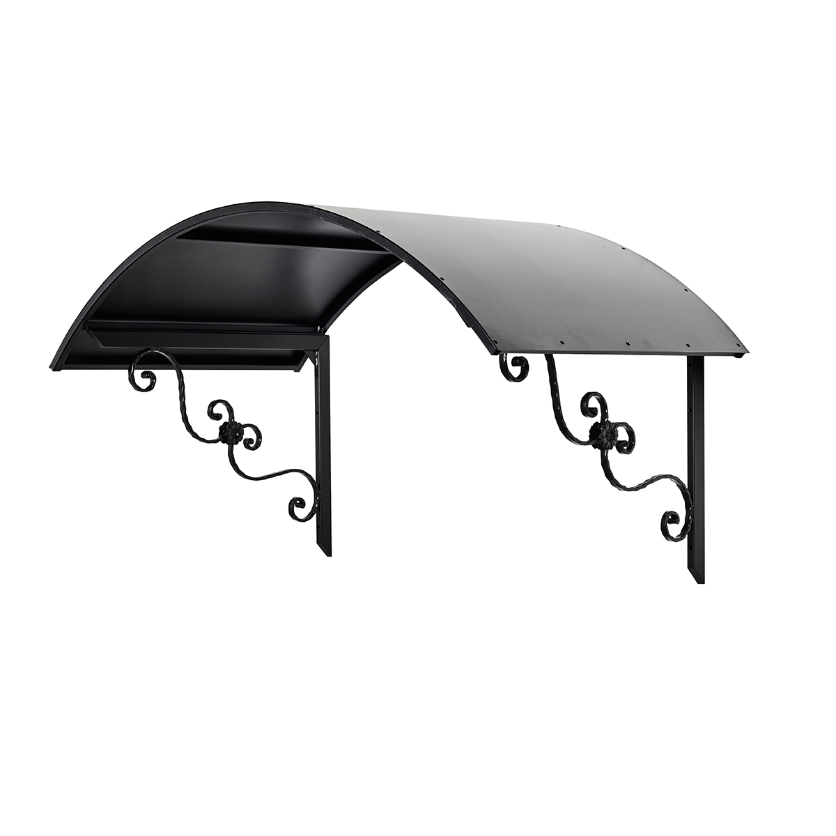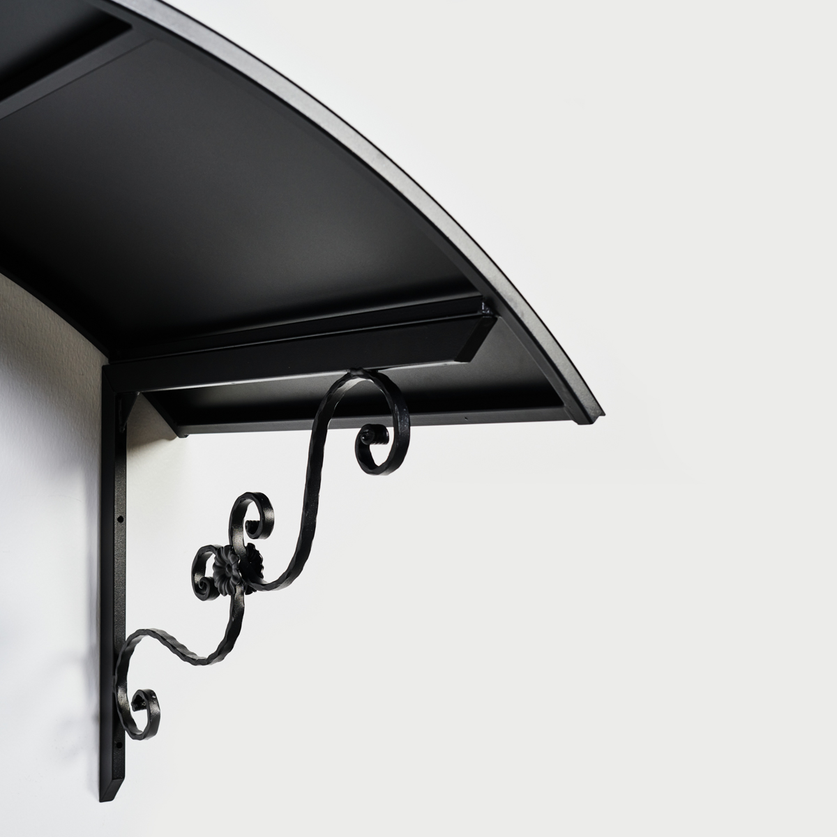 Musta kaareva ovikatos takorautaisilla S-koristeilla. Koristeiden liittymäkohdassa on kukkakoristeet. Suojaa ovi ja rappu tällä upealla pitkäikäisellä ovilipalla. Suomalaista laatutyötä.