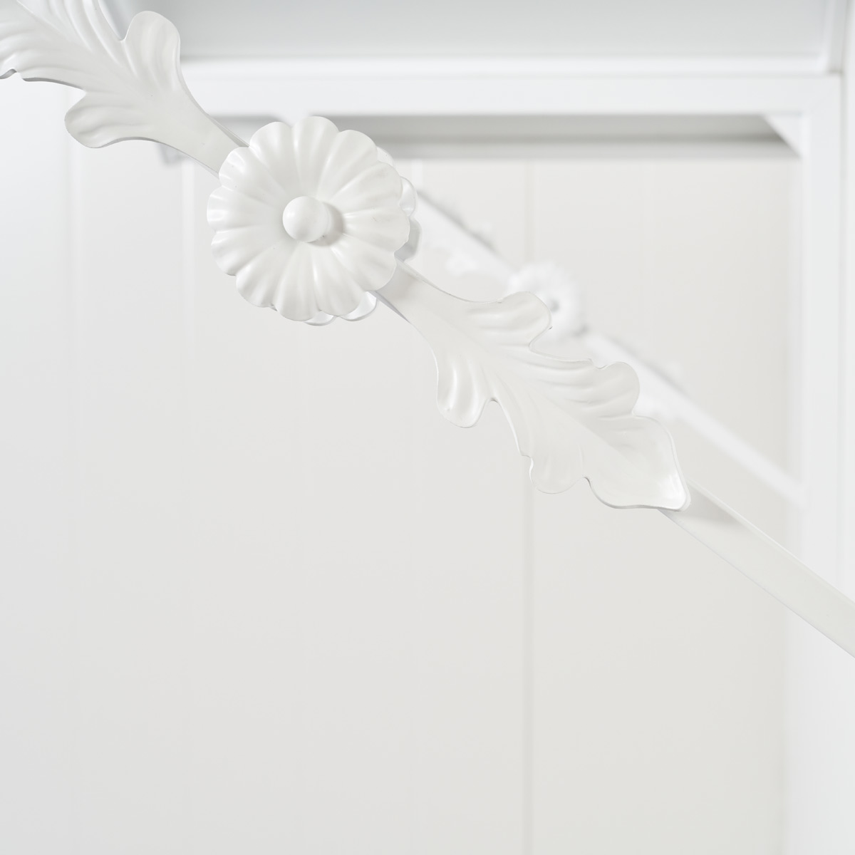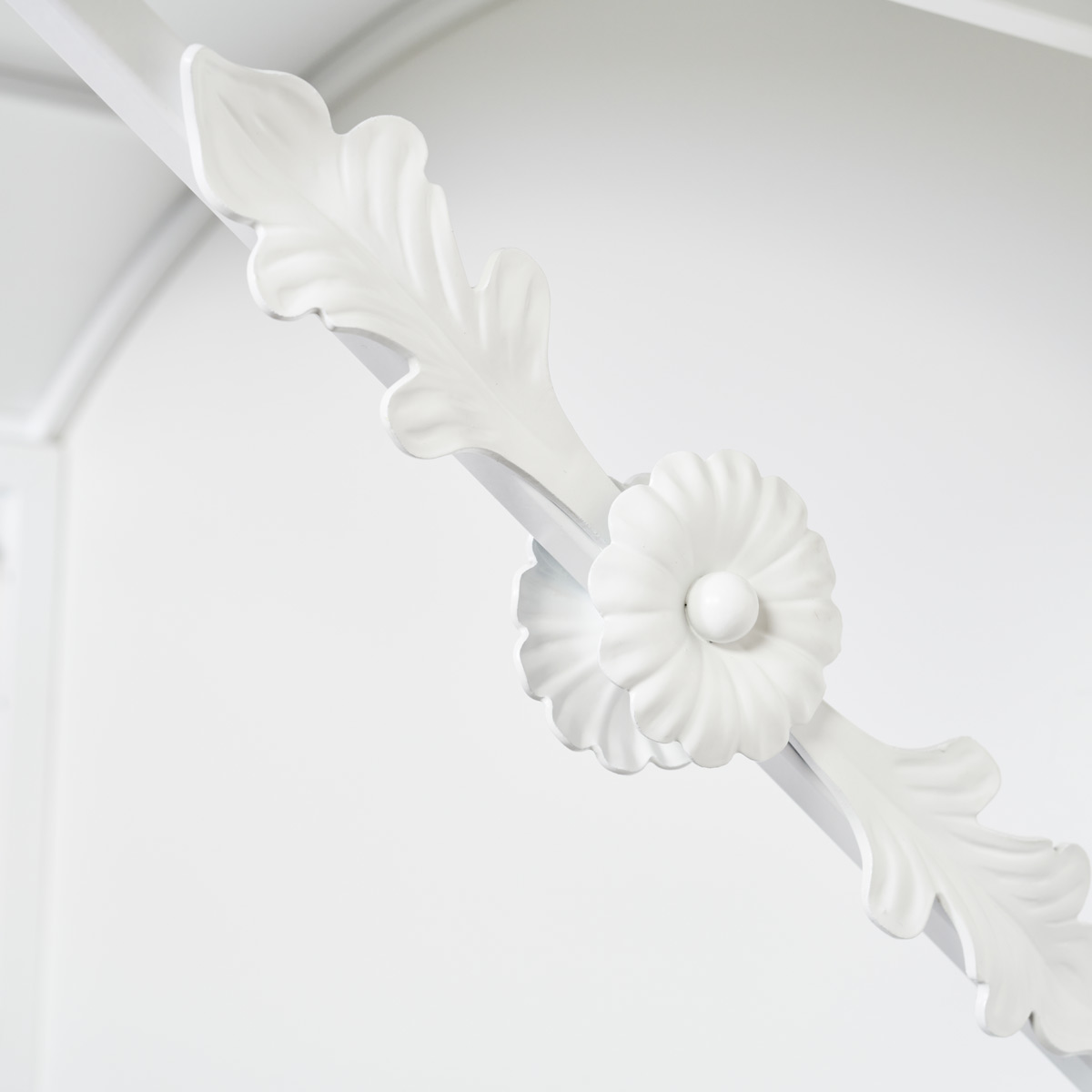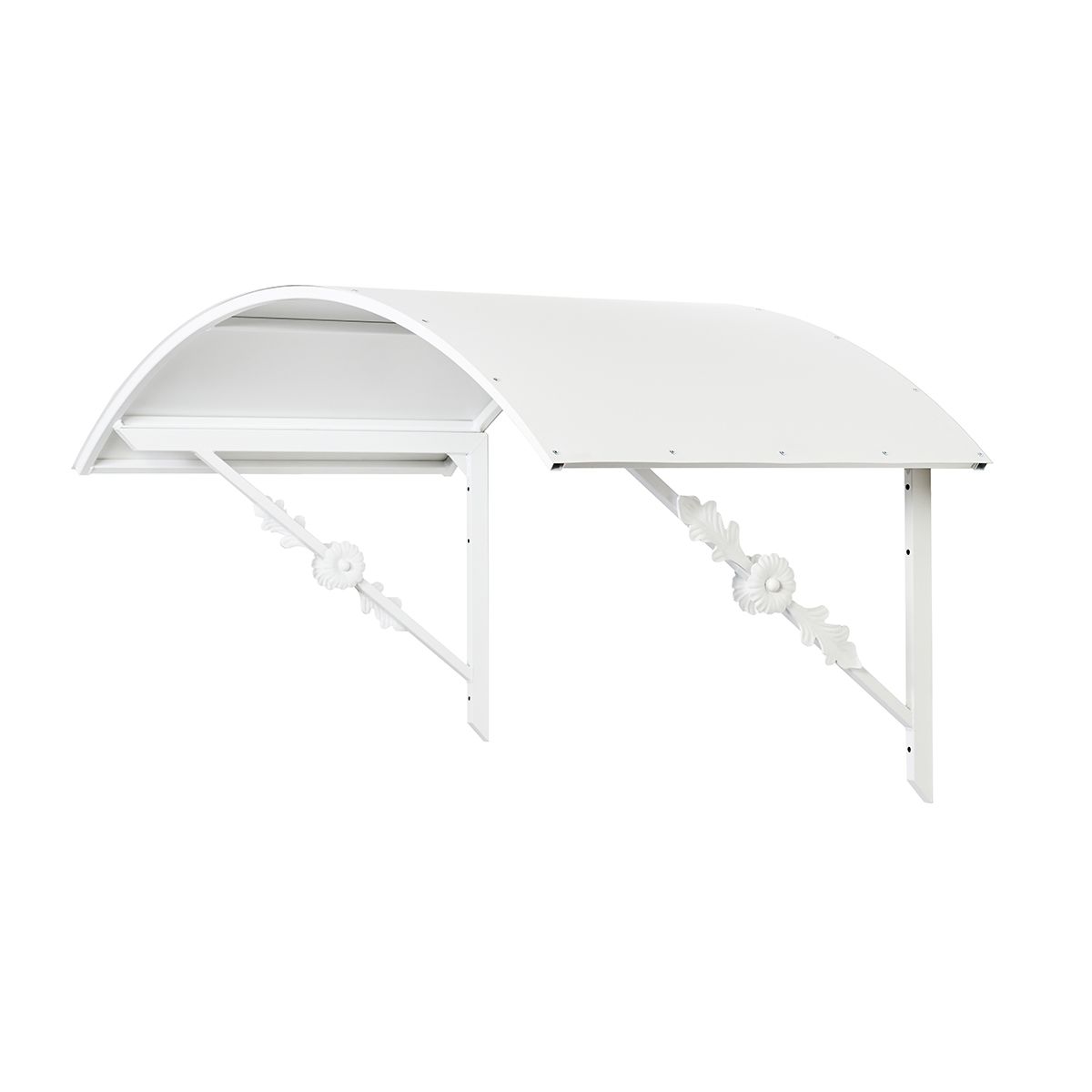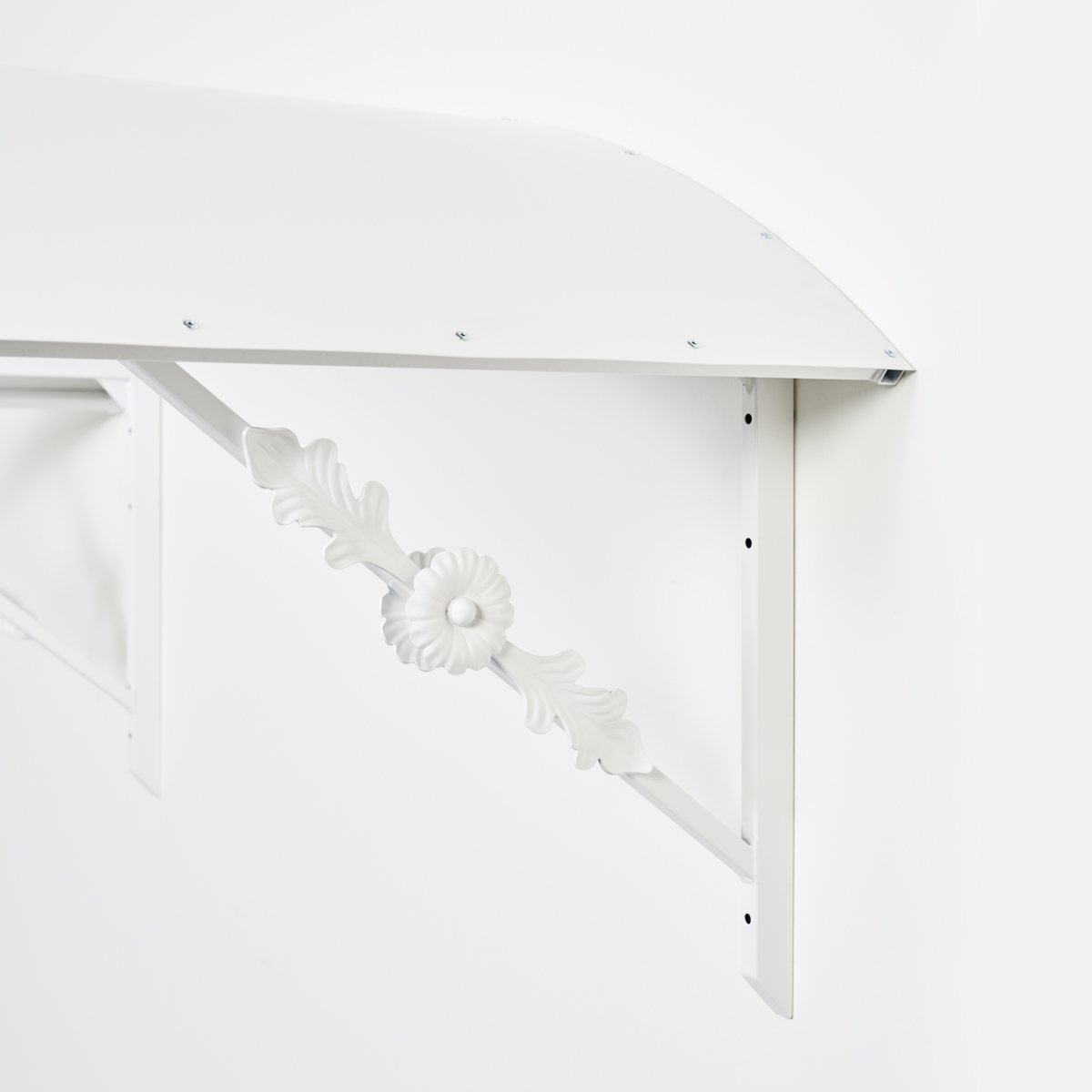 Kaareva ovikatos Firenze kukka- ja lehtikoristeilla on kuvassa valkoisena. Sivukoristeet on hitsattu katokseen kannakkeiden molemmin puolin, jolloin katos saa vimeistellyn leiman.