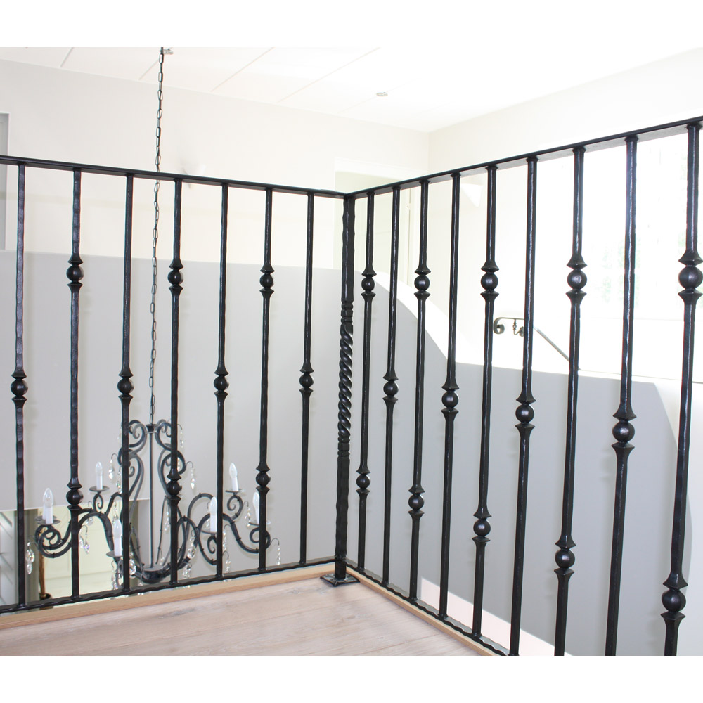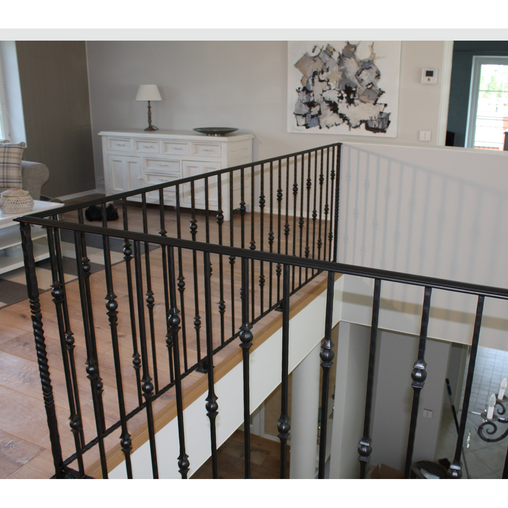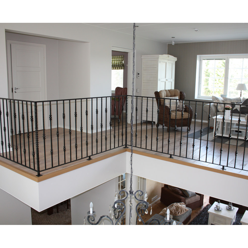 Tämä musta takorautainen yläkerran kaide valmistettiin Valkeskosken asuntomessukohteeseen mittatilauksena.
