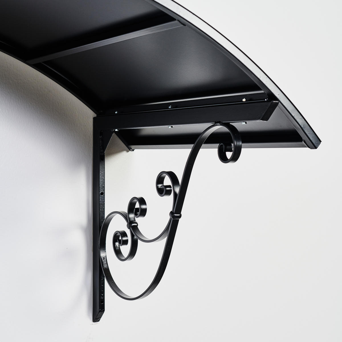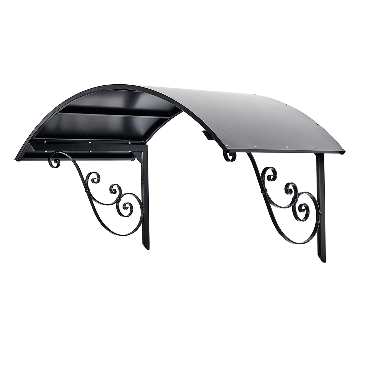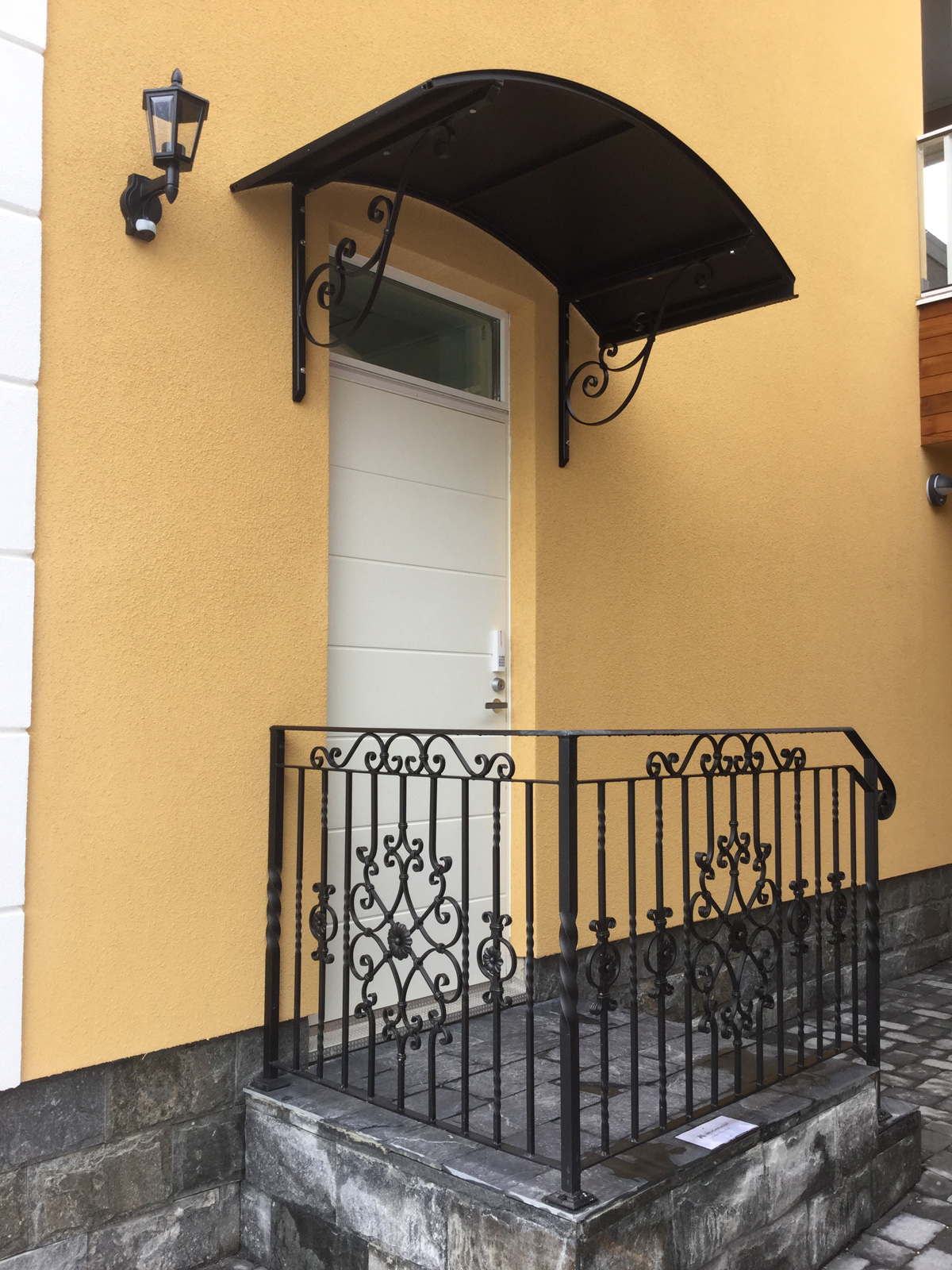 Laadukas ja pitkäikäinen katos oven päälle isoilla S-koristeilla.