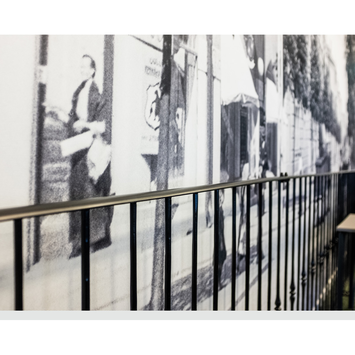 Valmistamme kaiteet ja aidat mittatilauksena, kuten tämänkin pystypinnaisen mustan takorautakaiteen museokeskus Vapriikin ravintola Valssiin. Tilaan ja taustaan yhteensopiva takorautakaide suojaa tyylikkäästi seinäpintaa, peittämättä sitä kuitenkaan liikaa. Takorauta on tyylikäs ja kestävä valinta sisustuselementiksikin. Tämä kaide on tehty käyttäen suoria ja koristeellisia kaidepinnoja, alareunassa lattarauta ja päällä kupera käsijohde.