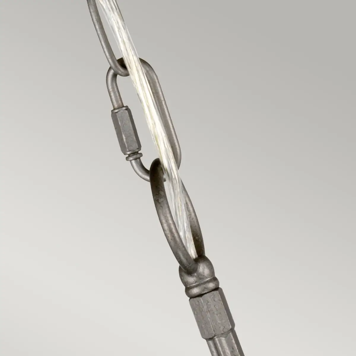 Harmaan valaisimen pinnassa on hopean hohtoa ja kehässä 6 lamppua. Kunkin lampun alla on yksityiskohtana pieni varsi ja lamput nousevat näin hieman kehyksestä ylöspäin. Valaisimessa on Royal Heritage tyylinen pitsimäinen kehys. Tästä takorautakruunusta on saatavilla myös pienempi koko.